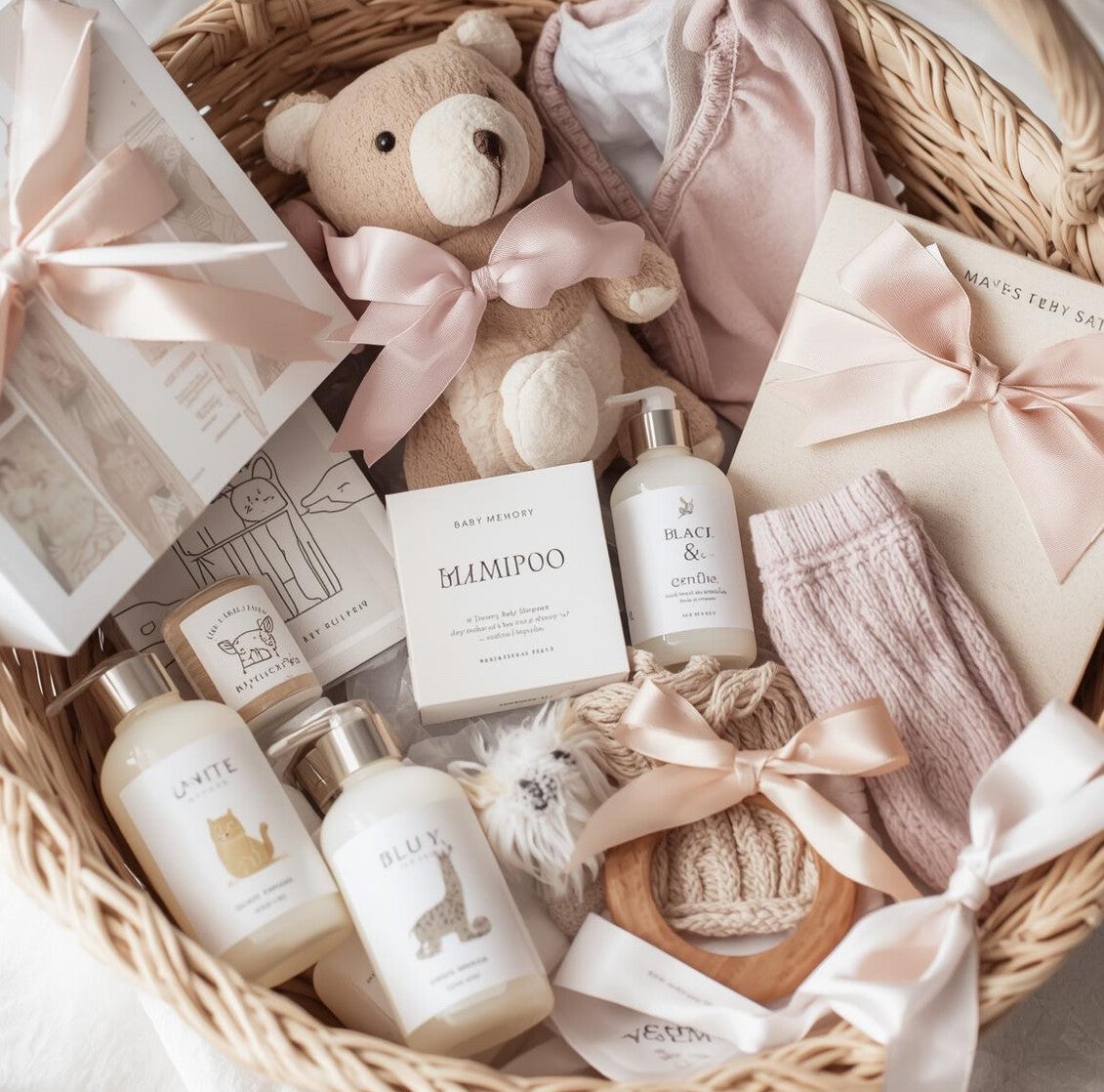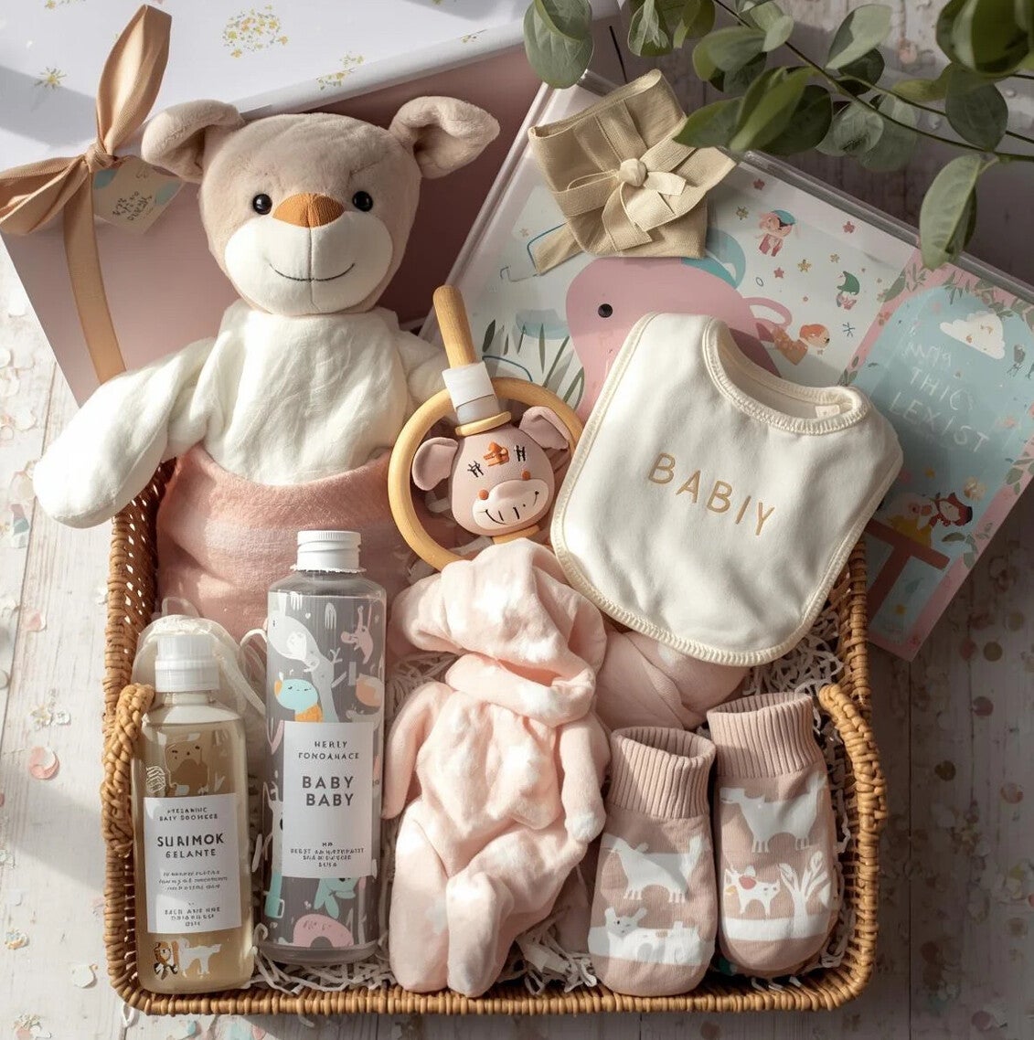 Handpicked soft, cuddly blanket and adorable plush toys with essential baby care items and keepsake memory books, these gifts are beautifully wrapped in box or basket and with complete with a complimentary card.